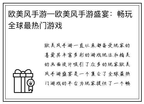 欧美风手游一直以来都备受玩家的喜爱,其丰富多彩的游戏玩法和精美的画面设计吸引了众多的玩家。欧美风手游盛宴是一个集合了全球最热门游戏的平台,为玩家提供了一个畅玩欧美风手游的机会。在这里,玩家可以尽情地享受各种游戏的乐趣,同时也能够结交更多志同道合的朋友。